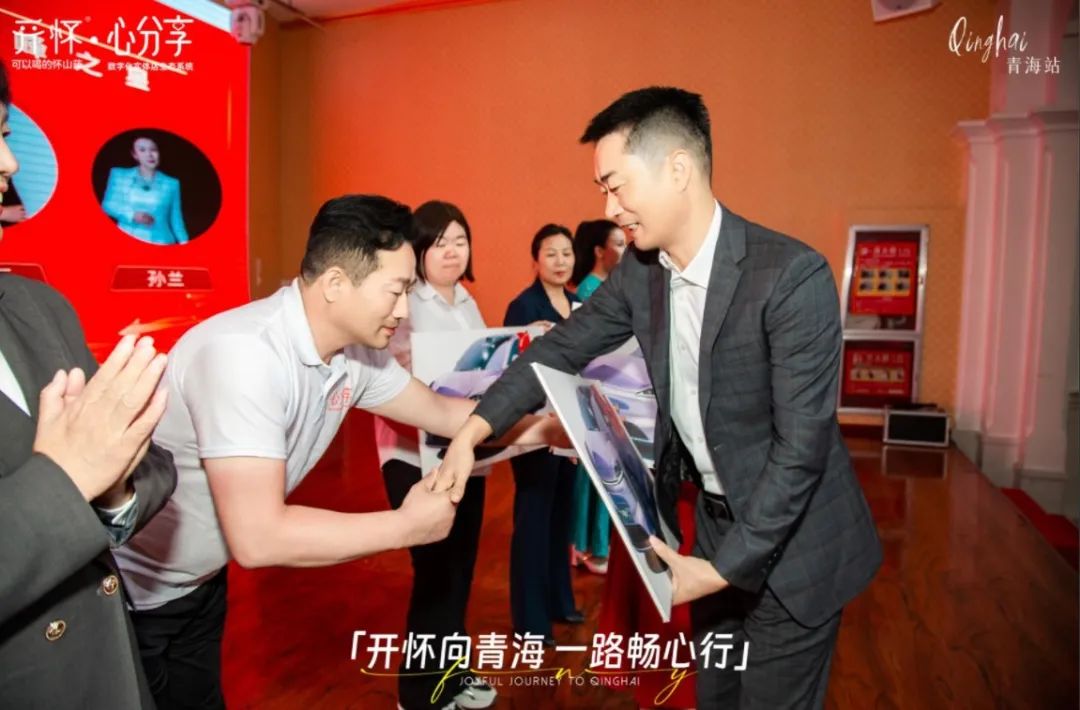 25位达成5万元业绩的经销商率先登台领奖。开怀·心分享销售商务副总监雷红丽、拓展总监郭晓丽为他们颁发荣誉证书及“六天五夜青海游”大奖,嘉奖其市场开拓的辛勤付出。