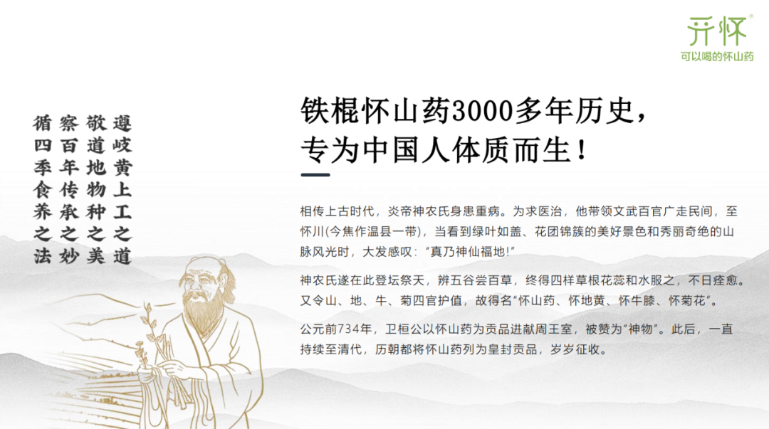 怀山药,正是这个赛道的“天选之子”。它的十几种功效覆盖了现代人最关注的“健脾、养胃、润肺、益肾”等需求;它的“全人群友好”属性(老人喝能补元气,年轻人喝能抗疲劳,孩子喝能健脾胃)打破了传统养生品的人群限制;它“无过量之忧”的特性,更让“日常饮用”成为可能——这些特质,让怀山药天然具备从“药材”到“快消饮品”的转化基因。