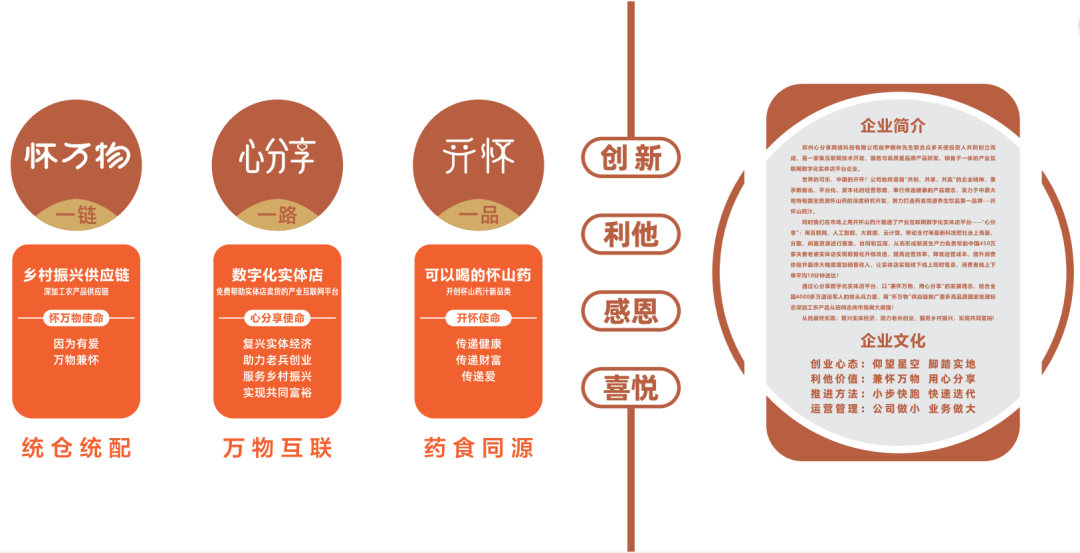 心分享公司是一家专注于互联网技术开发、高质量深加工品牌农产品研发及销售的产业互联网数字化实体店生态系统企业。研发推出了药食同源养生饮品品牌“开怀山药汁”,并以开怀山药汁为媒介和切入点,成功打造出了“心分享”数字化实体店生态系统:逐步免费赋能中国500万家实体店数字化升级改造,帮着产业链各方提高效率、降低费用并向消费者提供“线下线上同时售卖,线上下单平均18分钟送达”的极致购物体验。