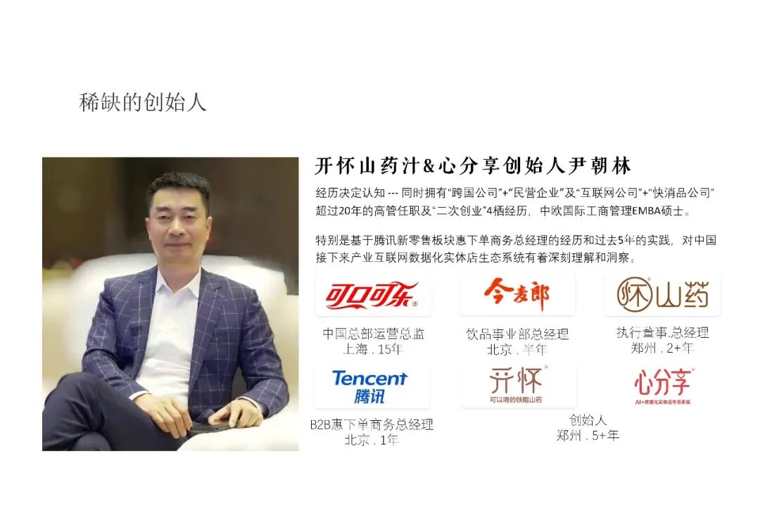 尹朝林,心分享AI+数据化实体店生态系统&开怀铁棍山药汁创始人,现郑州心分享网络科技有限公司董事长。