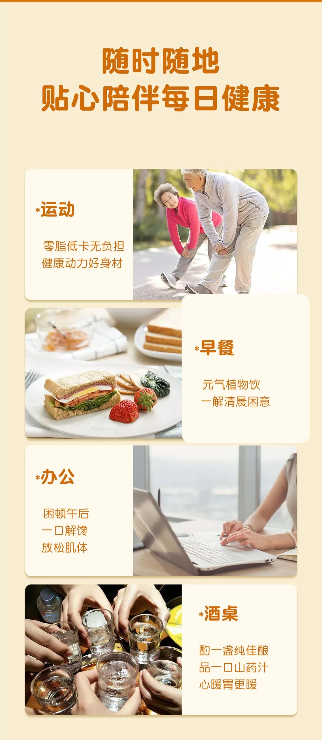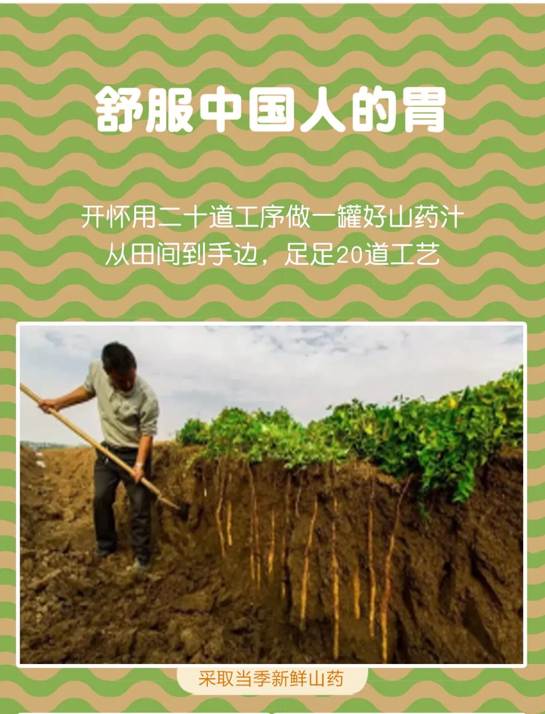 开怀山药汁是目前中国市场上唯一一款用土里植物的根茎直接制作,而不是用提取物或者香精调配而成的饮品。甄选温县道地出产正宗铁棍怀山药,山药原浆含量30%,不添加蔗糖、香精、防腐剂。